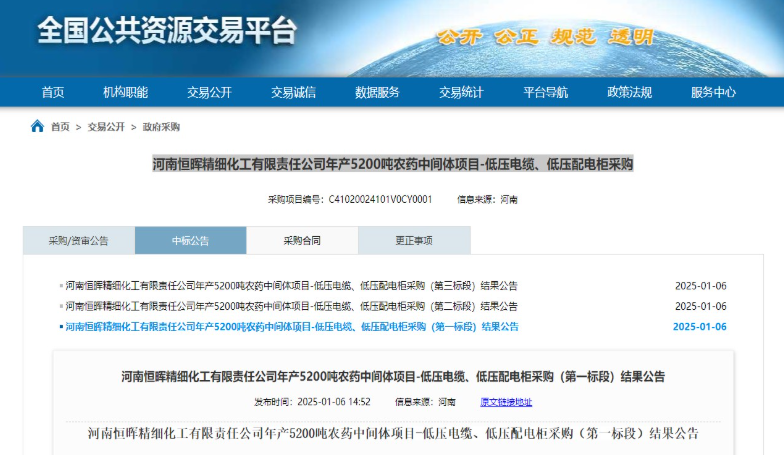 河南勝華電纜集團中標河南恒暉精細化工有限責任公司262萬電纜采購項目