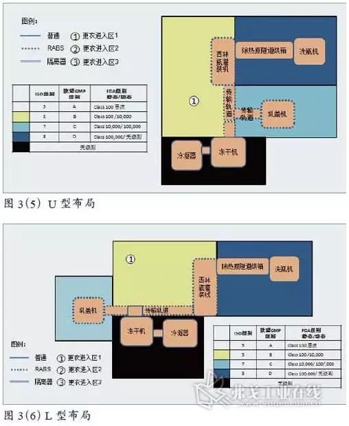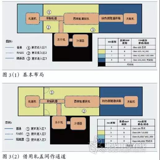 直線型灌裝線,采用O-RABS,核心受控區(qū)為B+A,這是今后若干年內(nèi)無菌小容量注射劑生產(chǎn)最多可能采用的方式,所以這里稱之為基本布局,見圖3(1)。灌裝生產(chǎn)線、輸送軌道和凍干機(jī)進(jìn)出料均在B級(jí)區(qū),洗瓶和除熱原隧道烘箱在D級(jí)區(qū),軋蓋設(shè)置在C級(jí)區(qū)。凍干機(jī)則在無級(jí)別區(qū)。