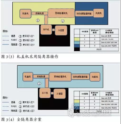 在這個(gè)方案中,對(duì)從除洗瓶機(jī)之外整條灌裝生產(chǎn)線采用隔離操作器。整個(gè)背景至少保持D級(jí)環(huán)境,見圖3(4)。隔離操作器的采用,本身也更適用于前述的激素類、高致敏性、毒性類的產(chǎn)品,由于隔離器的隔離保護(hù)較RABS更徹底,因此對(duì)高附加值、高質(zhì)量要求的產(chǎn)品來說也是較好的選擇。