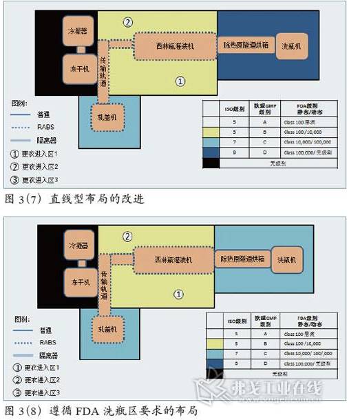 由于所有設(shè)施均在一個(gè)房間,在生產(chǎn)方面具有很好的聯(lián)通性。通過對(duì)環(huán)境要求的降低,也節(jié)約了能耗和運(yùn)行成本。在環(huán)境控制和相互影響方面,例如除熱原隧道烘箱帶來熱量的發(fā)散、從房間抽取空氣帶來的新風(fēng)補(bǔ)充問題,以及洗瓶機(jī)帶來的濕度控制問題等,需在設(shè)計(jì)中妥善考慮,但不在本文的討論范圍。