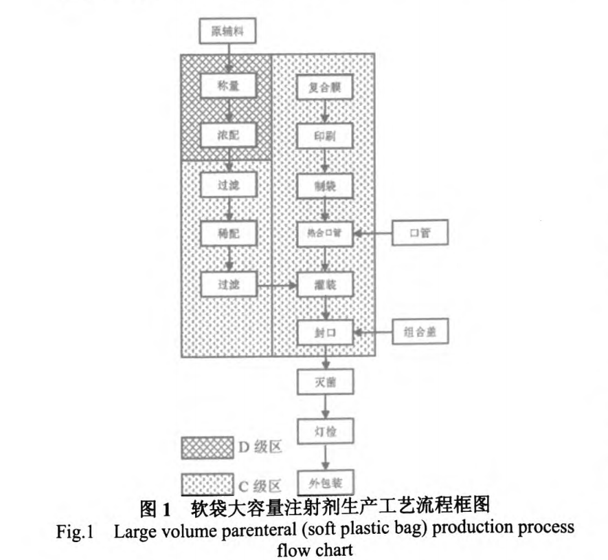 大輸液的生產(chǎn)過程主要包括原輔料的準(zhǔn)備、稱量、濃配、稀配、灌封、滅菌、燈檢、外包裝等工序。圖1、2、3分別為軟袋大輸液的生產(chǎn)工藝流程框圖、塑瓶大輸液的生產(chǎn)工藝流程框圖以及玻瓶大輸液的生產(chǎn)工藝流程框圖。